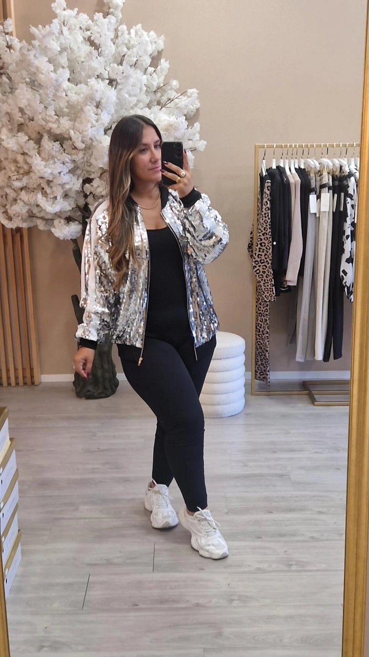 Bomber com corte oversize. Com lantejoulas. Tamanho único, veste S M L XL.
