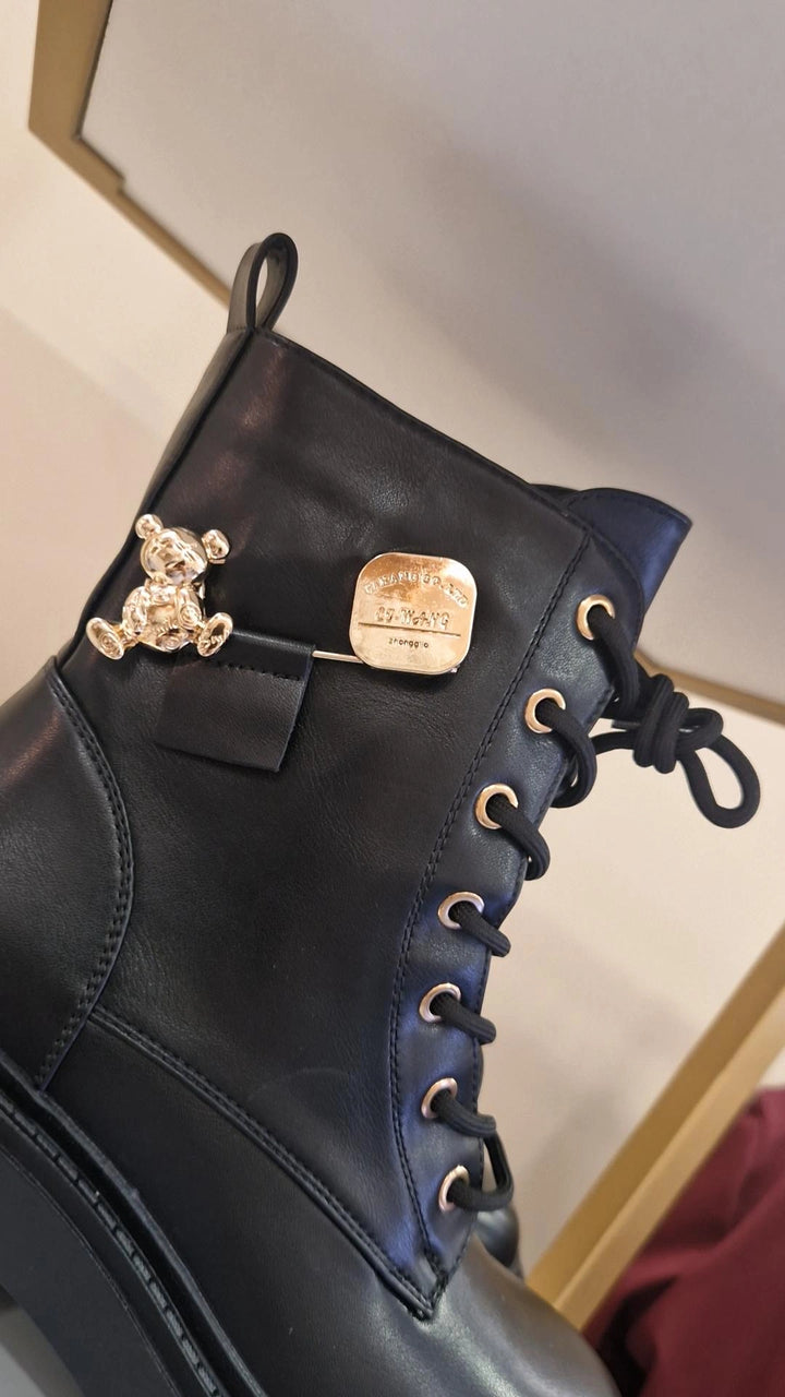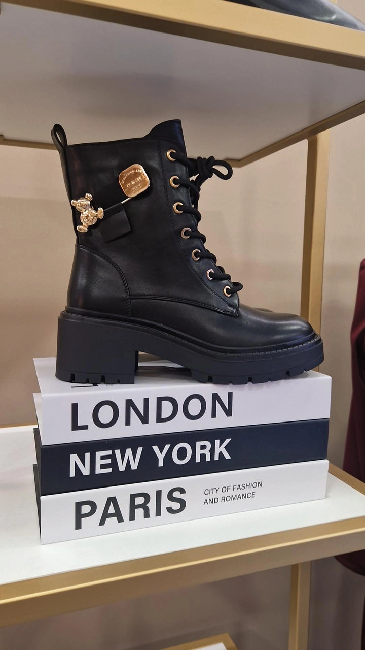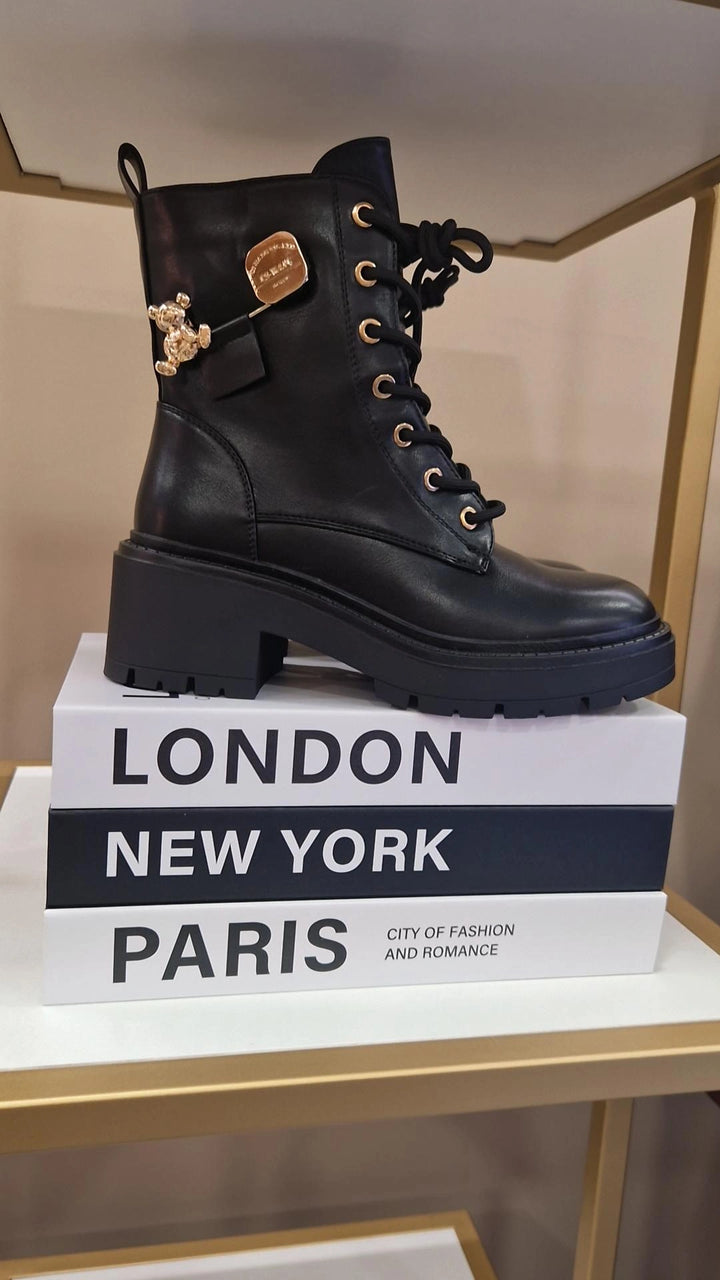 Bota militar com pormenores dourados. Com cordões e fecho.