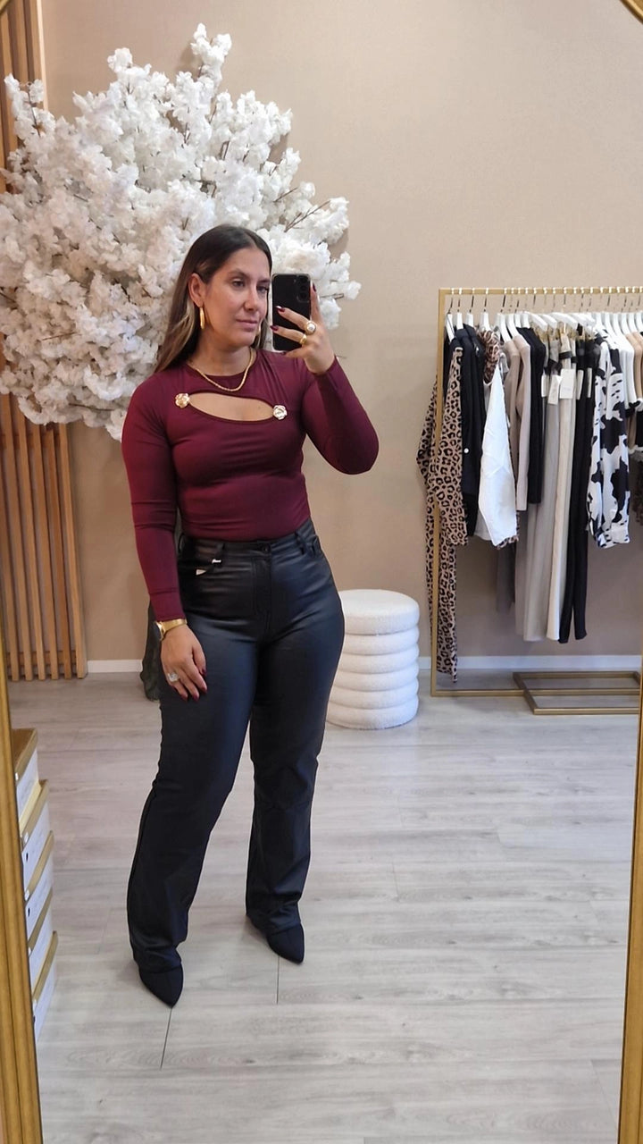 Calça com corte reto. Cintura subida e com elastano. Com carda.