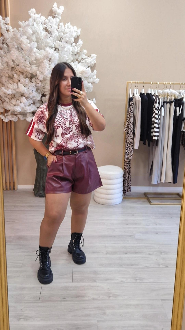 Calção em ecopele. Com bolsos e elástico na cintura. Cinto incluído. Tamanho único, veste S M L XL.