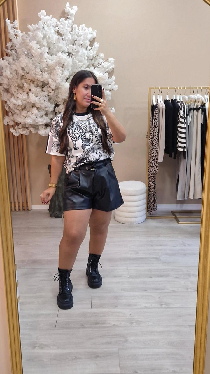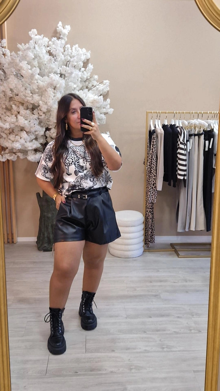 Calção em ecopele. Com bolsos e elástico na cintura. Cinto incluído. Tamanho único, veste S M L XL.