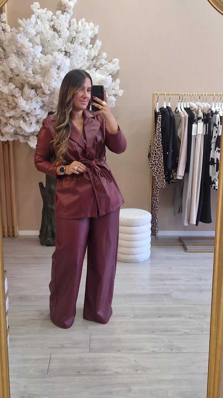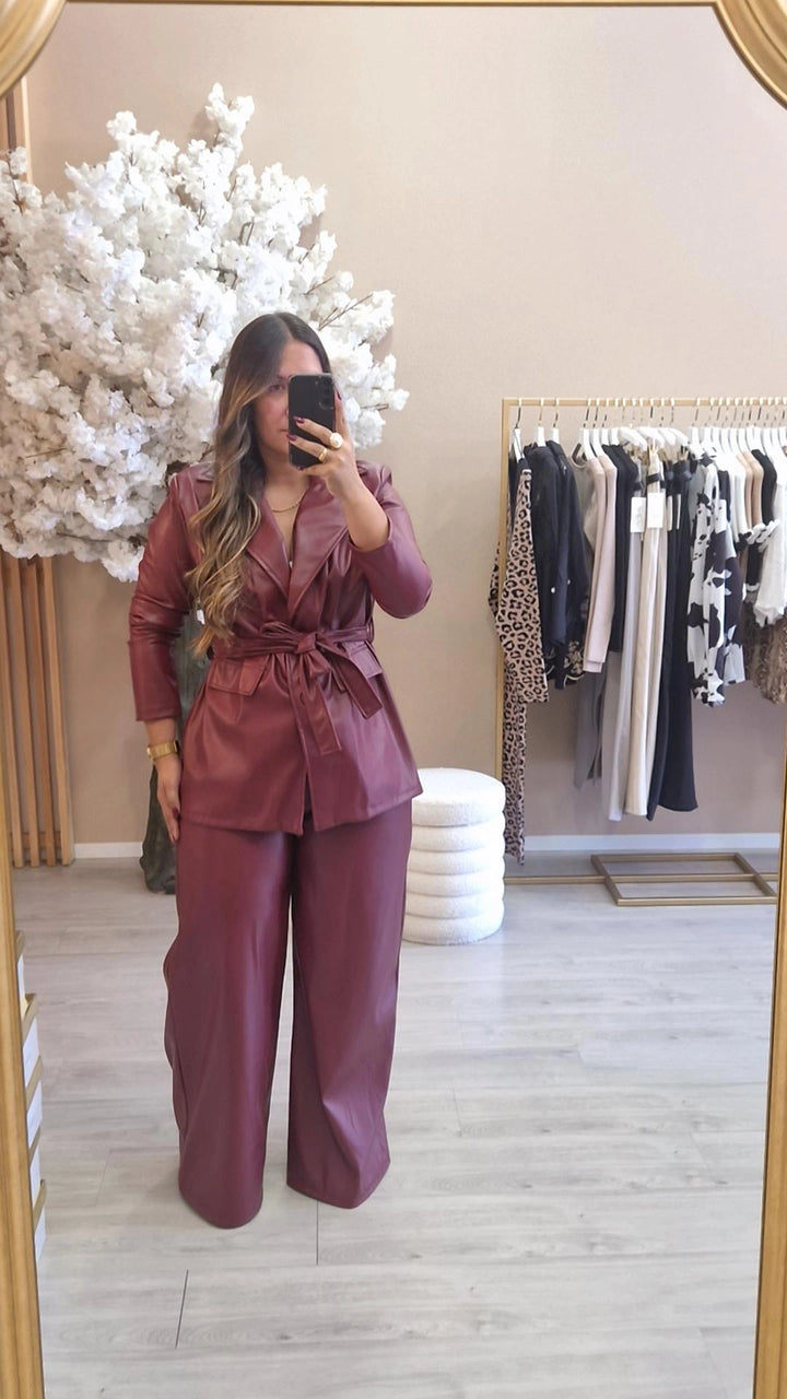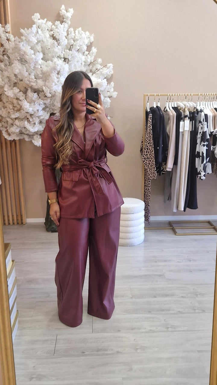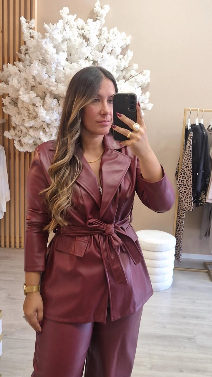 Fato em ecopele com elastano. Calça com bolsos e elástico na cintura. Blazer com ombreiras. Tamanho único, veste M L XL.