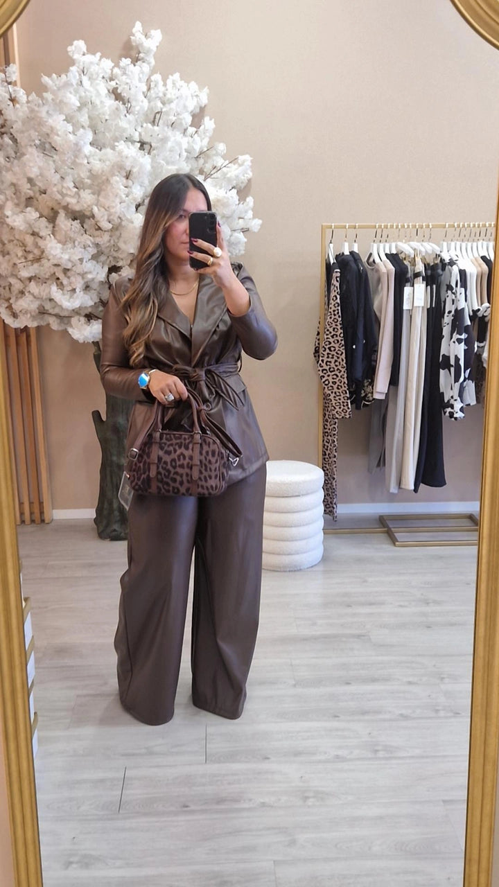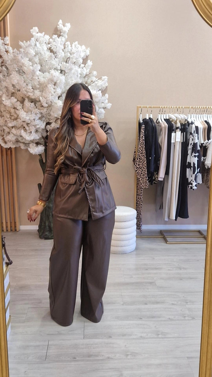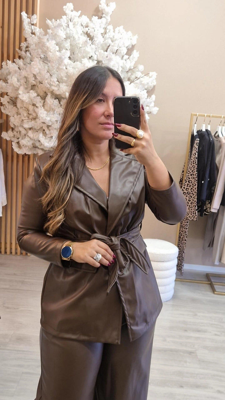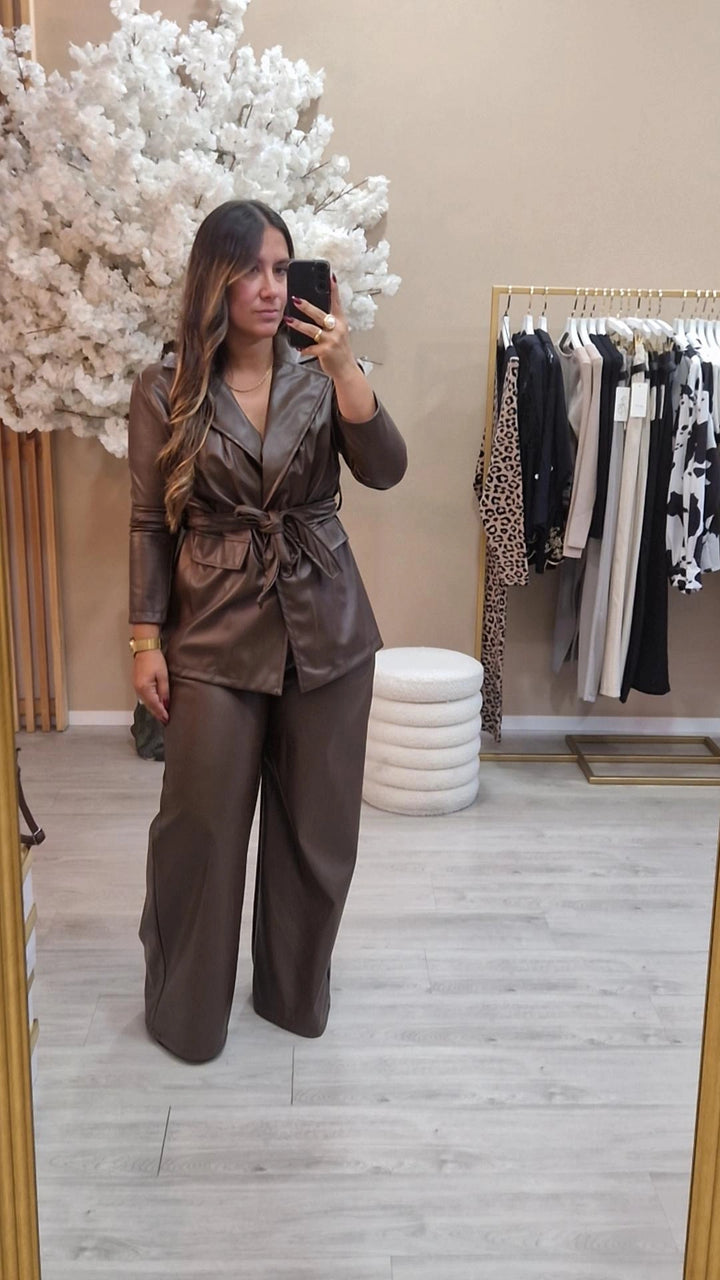 Fato em ecopele com elastano. Calça com bolsos e elástico na cintura. Blazer com ombreiras. Tamanho único, veste M L XL.