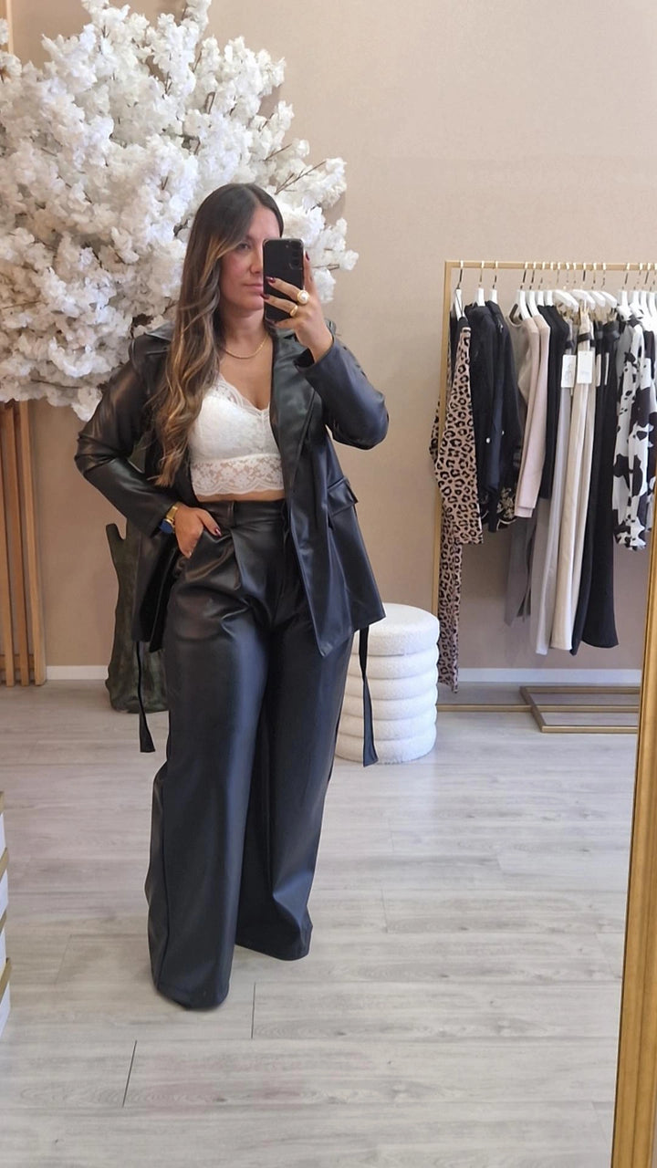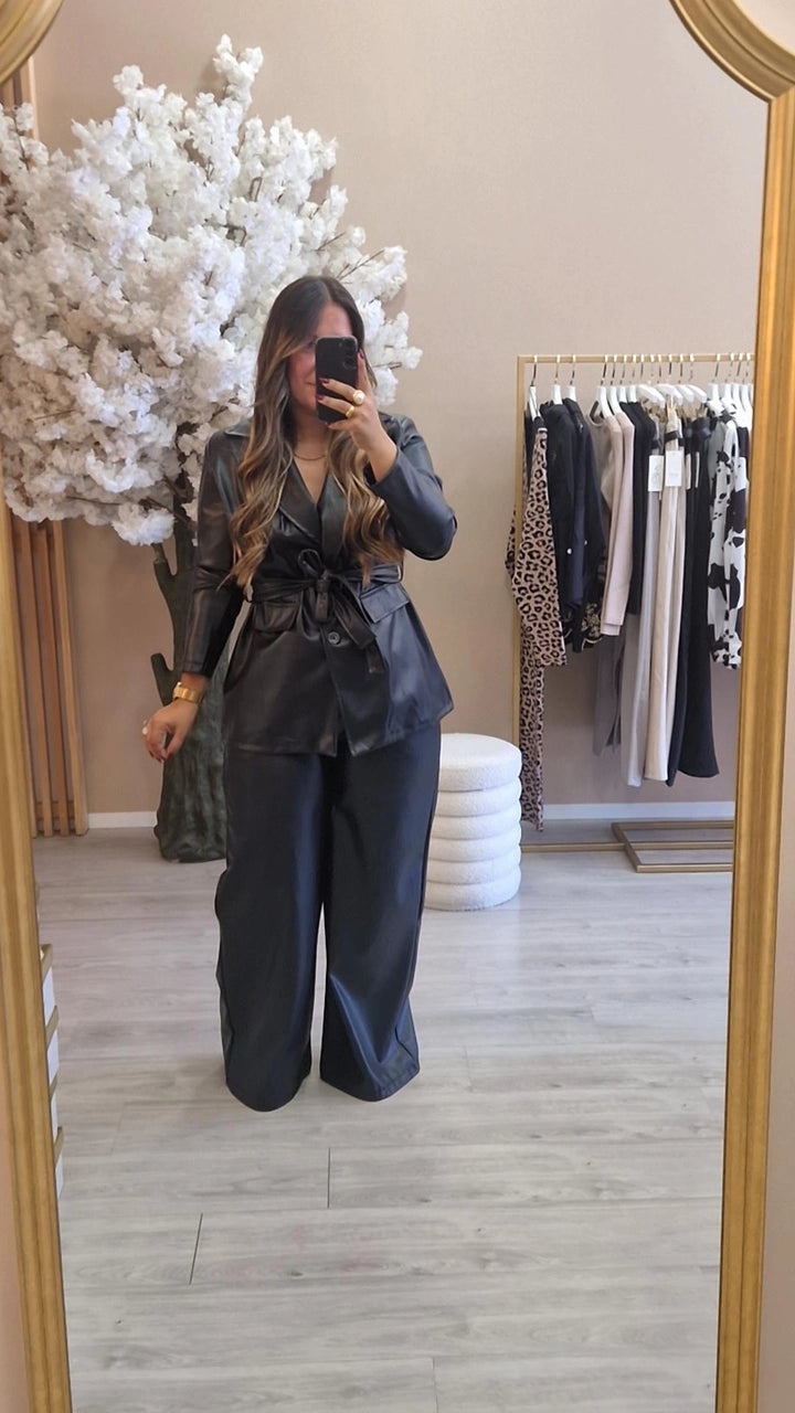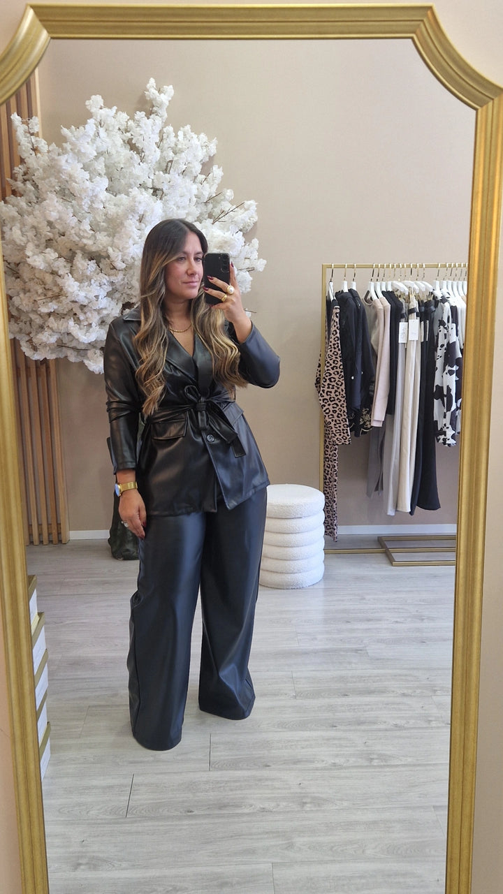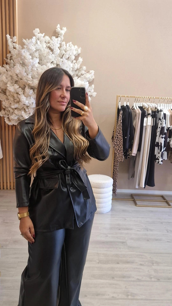 Fato em ecopele com elastano. Calça com bolsos e elástico na cintura. Blazer com ombreiras. Tamanho único, veste M L XL.