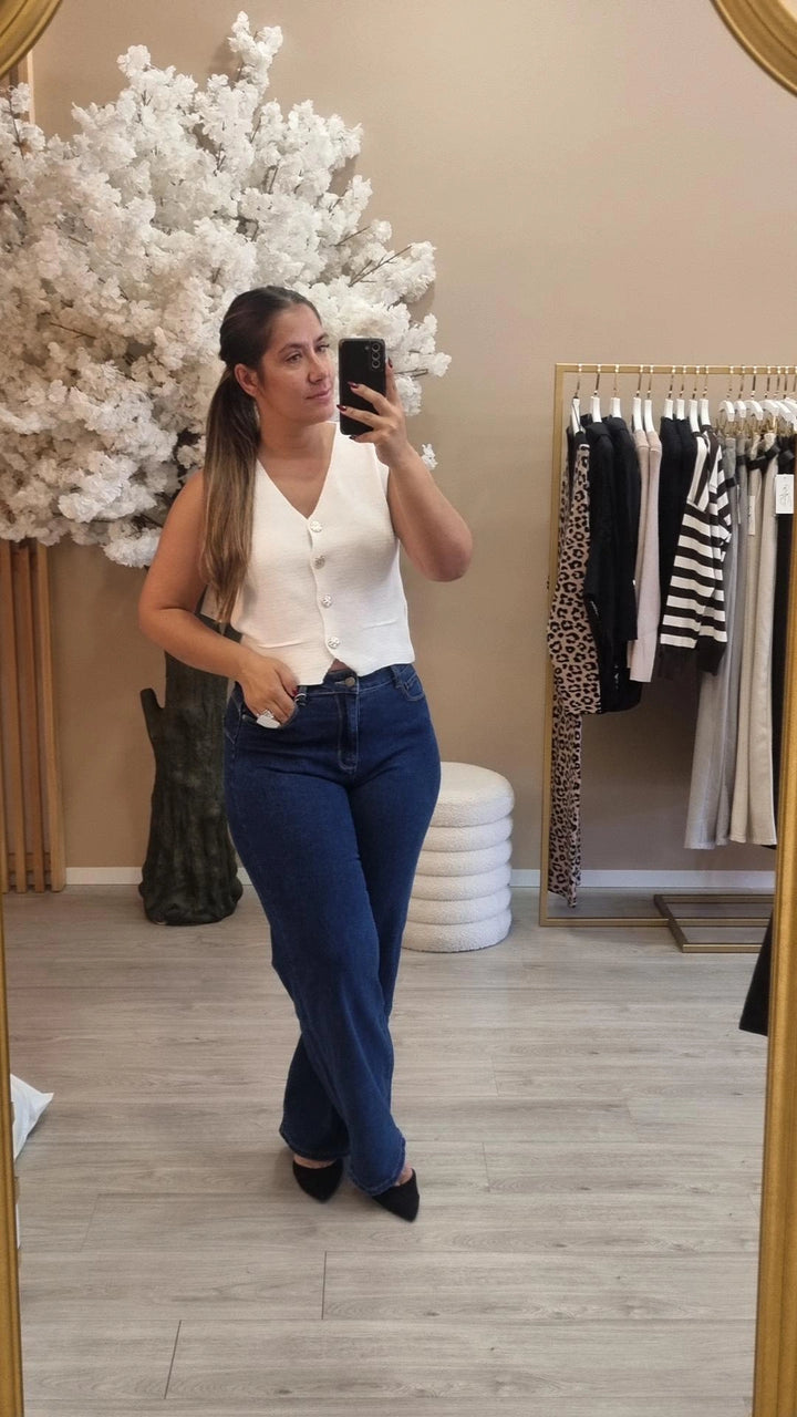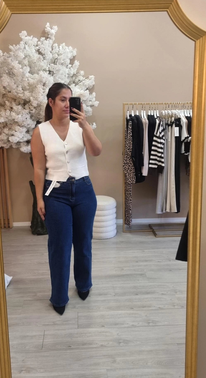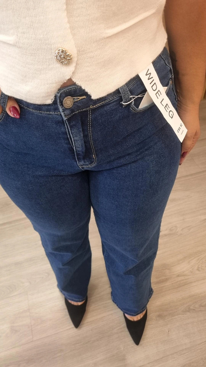 Calça com corte wideleg. Cintura subida e com elastano. Push-Up.