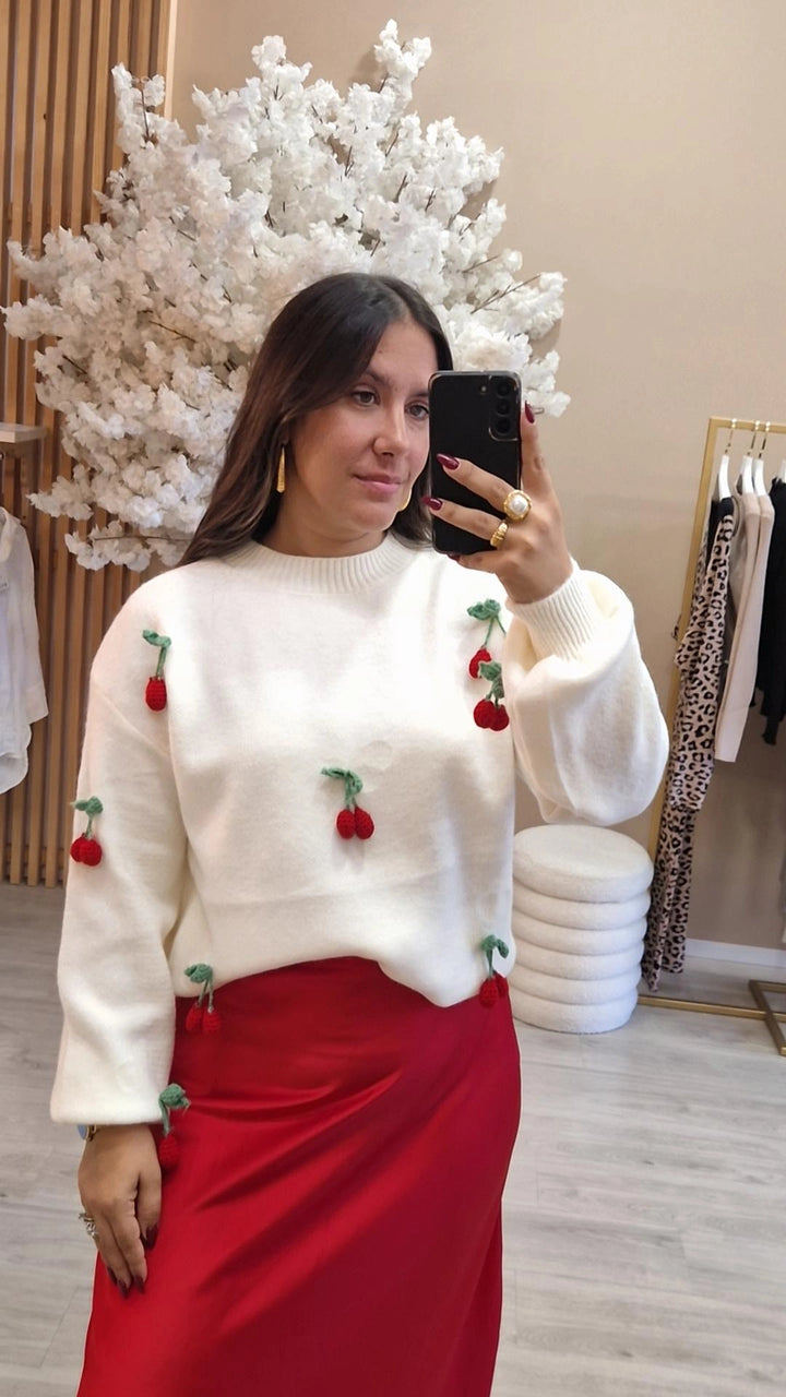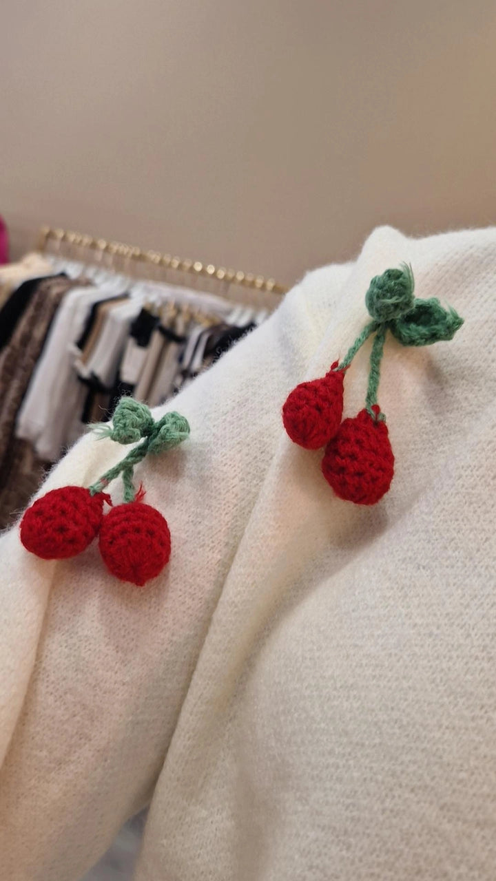 Malha com cerejas em crochê. Vêm marcado como M/L e XL/XXL mas consideramos tamanho único (não faz diferença entre tamanhos).